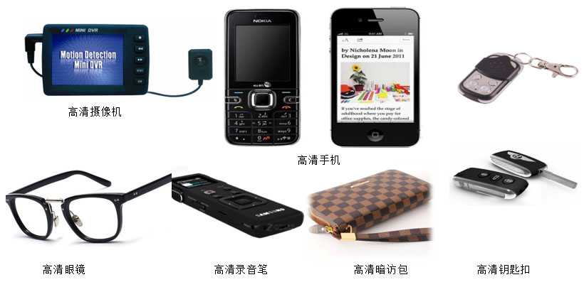 为满足市场调查的需要,公司拥有近百台设备,十余个分类,分别是夹包、钱包系列、可乐瓶系列、钥匙扣系列、手机系列、笑脸系列、纽扣系列、摄像笔系列、手表系列、眼镜类系列、录音电话及录音笔系列等。