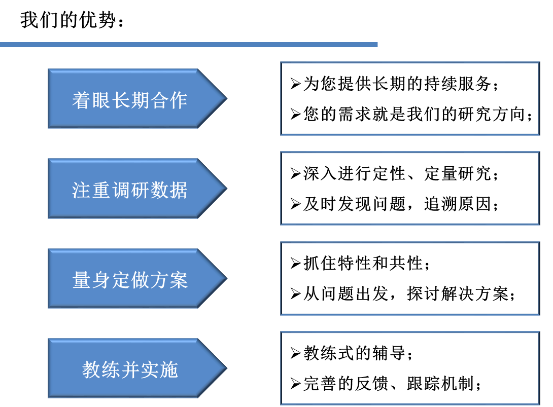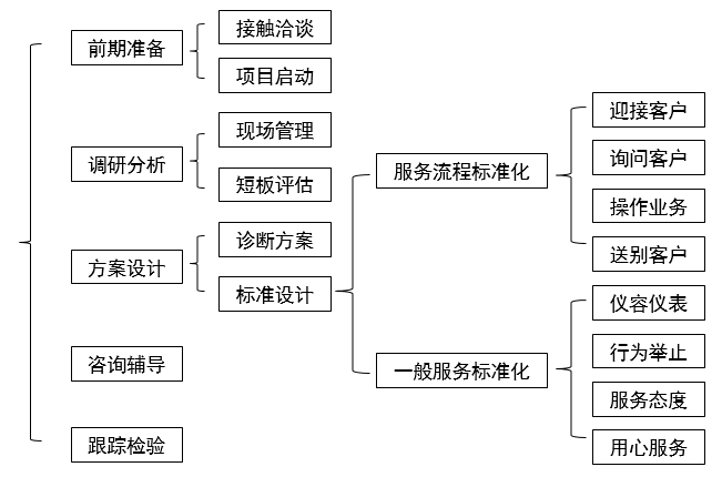 服务标准化咨询项目是恒道公司面向客户推出的一项新的服务项目。该项目打破传统服务调查工作中单纯数据分析,对窗口服务行业的问题进行梳理和归纳,根据调查现状,将服务过程中经常出现的规范化问题和标准编撰成针对性高、操作性强的具体方案与建议,通过“调查、分析、咨询、跟踪”这一系统化措施,努力实现客户要求,保障服务能力的不断提升,实现服务标准化和规范化。